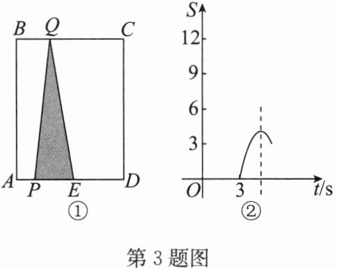 3. 如图①,在矩形 ABCD 中,AB=8,E 是 AD 的中点. 动点 P 从点 A 出发,以每秒 1 个单位长度的速度沿 AD 向点 D 运动,同时动点 Q 从点 B 出发,以每秒 2 个单位长度的速度沿折线 B—C—D 运动,当一点到达点 D 时,另一点也随之停止运动. 连接 PQ,EQ,设动点 P 运动的时间为 t 秒,△EPQ 的面积为 S,当点 P 与点 E 重合时,记 S=0. 图②中的曲线是动点 Q 在线段 CD 上时 S 与 t 的函数图像.