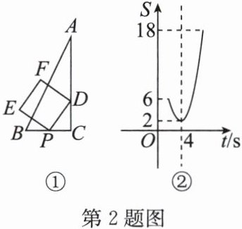 2. (2024·姑苏区校级月考)如图①,在 Rt△ABC 中,∠C=90°,D 为 AC 上一点,CD=$\sqrt{2}$,动点 P 以每秒 1 个单位长度的速度从点 C 出发,沿折线 C—B—A 匀速运动,到达点 A 时停止,以 DP 为边作正方形 DPEF. 设点 P 的运动时间为 t s,正方形 DPEF 的面积为 S. 在点 P 由点 B 到点 A 的运动过程中,经探究发现 S 是关于 t 的二次函数,并绘制成如图②所示的图像. 根据图像信息,可知线段 AB 的长是