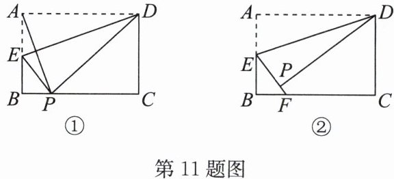 11. 在矩形$ABCD$中,$AB = 8$,$AD = 12$。将矩形折叠,使点$A$落在点$P$处,折痕为$DE$。