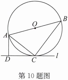 10. (2024·盐城)如图,点$C$在以$AB$为直径的$\odot O$上,过点$C$作$\odot O$的切线$l$,过点$A$作$AD⊥ l$,垂足为$D$,连接$AC$,$BC$。