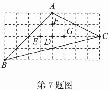 7. 如图所示的网格由边长相同的小正方形组成,点$A$,$B$,$C$,$D$,$E$,$F$,$G$在小正方形的顶点上,则$△ ABC$的重心是(