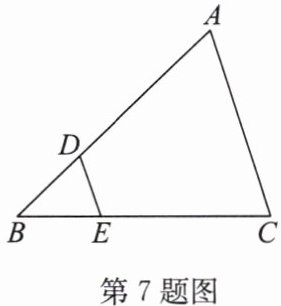7. 如图,在$△ ABC$中,点$D$,$E$分别在边$AB$,$BC$上,若$\frac{BD}{BA}=\frac{BE}{BC}=\frac{1}{3}$,则$△ BDE$与四边形$ADEC$的面积比是