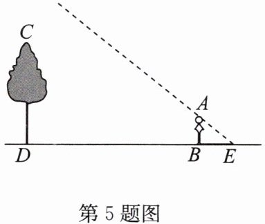 5. 如图,小华同学的身高 $AB$ 为 $1.6\ \mathrm{m}$,某一时刻他在阳光下的影长 $BE$ 为 $2\ \mathrm{m}$,与他邻近的一棵树 $CD$ 的影长 $DF$ 为 $6\ \mathrm{m}$。