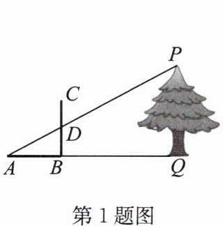 1. 《周髀算经》中记载了“偃矩以望高”的方法,“矩”在古代指两条边呈直角的曲尺(即图中的 $ABC$)。“偃矩以望高”的意思是把“矩”仰立放,可测量物体的高度。如图,点 $A$,$B$,$Q$ 在同一水平线上,$∠ ABC$ 和 $∠ AQP$ 均为直角,$AP$ 与 $BC$ 相交于点 $D$。测得 $AB = 40\ \mathrm{cm}$,$BD = 20\ \mathrm{cm}$,$BQ = 11.6\ \mathrm{m}$,则树高 $PQ$ 为(