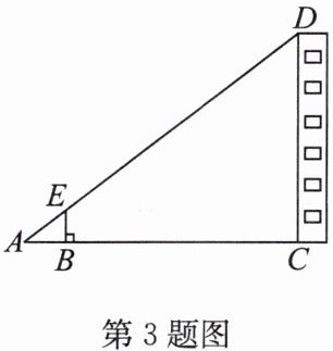3. 如图,利用与水平地面垂直的标杆 $BE$ 测量建筑物的高度,标杆 $BE$ 高 $1.5\ \mathrm{m}$,测得 $AB = 2\ \mathrm{m}$,$BC = 14\ \mathrm{m}$,则建筑物的高 $CD$ 为