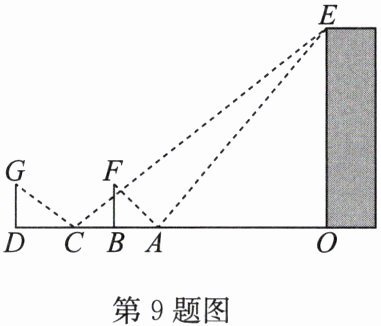 9. 如图,为了测量一栋楼的高度 $OE$,小明同学先在操场上 $A$ 处放一面镜子,向后退到 $B$ 处,恰好在镜子中看到楼的顶部 $E$;再将镜子放到 $C$ 处,然后后退到 $D$ 处,恰好再次在镜子中看到楼的顶部 $E$($O$,$A$,$B$,$C$,$D$ 在同一条直线上)。测得 $AC = 2\ \mathrm{m}$,$BD = 2.1\ \mathrm{m}$,如果小明的眼睛距离地面的高度 $BF$,$DG$ 为 $1.6\ \mathrm{m}$,试确定楼的高度 $OE$。