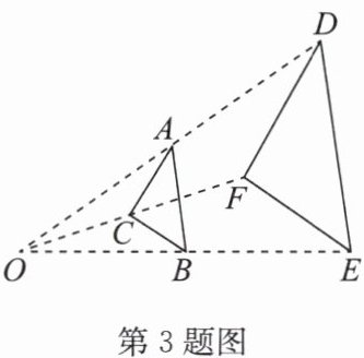3. 如图,$△ ABC$与$△ DEF$位似,点$O$是它们的位似中心,其中$OE = 2OB$,则$△ ABC$与$△ DEF$的周长之比是(