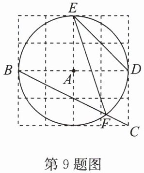 9. 如图,在边长为 $ 1 $ 的小正方形组成的网格中,点 $ A $,$ B $,$ C $,$ D $,$ E $ 均在格点上,半径为 $ 2 $ 的 $ \odot A $ 与 $ BC $ 交于点 $ F $,则 $ \tan ∠ DEF = $