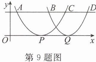 9. 如图,平面直角坐标系中有两条抛物线,它们的顶点$P,Q$都在$x$轴上,平行于$x$轴的直线与两条抛物线相交于$A,B,C,D$四点,若$AB=10,BC=5,CD=6$,则 $PQ$的长度为 (