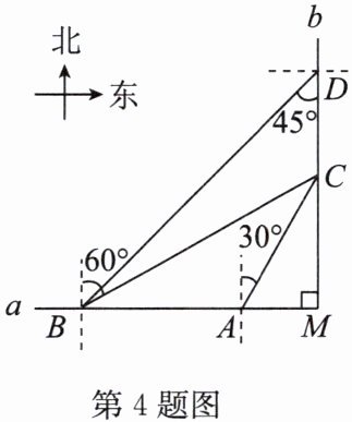 4. (2025·长沙)如图,某景区内两条互相垂直的道路 $ a,b $ 交于点 $ M $,景点 $ A,B $ 在道路 $ a $ 上,景点 $ C $ 在道路 $ b $ 上. 为了进一步提升景区品质,景区管委会在道路 $ b $ 上又开发了风景优美的景点 $ D $. 经测得景点 $ C $ 位于景点 $ B $ 的北偏东 $ 60^{\circ} $ 方向上,位于景点 $ A $ 的北偏东 $ 30^{\circ} $ 方向上,景点 $ B $ 位于景点 $ D $ 的南偏西 $ 45^{\circ} $ 方向上. 已知 $ AB = 800\ \mathrm{m} $.