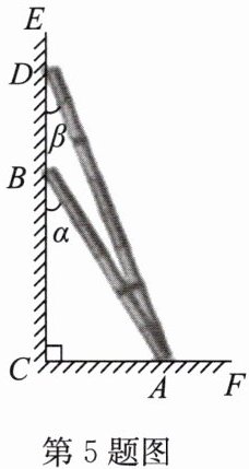 5. (2024·姑苏区期中)如图,两根竹竿 $ AB $ 和 $ AD $ 斜靠在墙 $ CE $ 上,量得 $ ∠ ABC = α, ∠ ADC = β $,则竹竿 $ AB $ 与 $ AD $ 的长度之比为 (