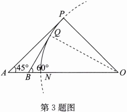 3. (2025·宜宾)如图,扇形 $ OPN $ 为某运动场内的投掷区,$\overset{\frown}{PN}$ 所在圆的圆心为点 $ O $,点 $ A $,$ B $,$ N $,$ O $ 在同一直线上. 直线 $ AP $ 与 $\overset{\frown}{PN}$ 所在 $ \odot O $ 相切于点 $ P $,此时测得 $ ∠ PAO = 45° $;从点 $ A $ 处沿 $ AO $ 方向前进 8.0 m 到达点 $ B $ 处. 直线 $ BQ $ 与 $\overset{\frown}{PN}$ 所在 $ \odot O $ 相切于点 $ Q $,此时测得 $ ∠ QBO = 60° $.(参考数据:$\sqrt{2} \approx 1.41$,$\sqrt{3} \approx 1.73$,$π \approx 3.14$)