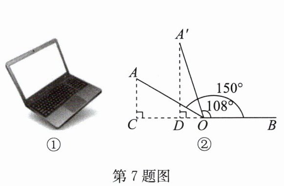 7. (2024·盐都区三模)图①是一台笔记本电脑实物图,如图②,当笔记本电脑的张角 $ ∠ AOB = 150° $ 时,顶部边缘 $ A $ 处离桌面的高度 $ AC $ 为 11 cm,当笔记本电脑的张角 $ ∠ A'OB = 108° $ 时,顶部边缘 $ A' $ 处离桌面的高度 $ A'D $ 约为