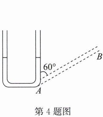 4. 如图,往竖直放置的粗细均匀的“U”形装置($ A $ 处由短软管连接)中注入一定量的水,水面高度为 9 cm,现将右边细管绕 $ A $ 处顺时针旋转 $ 60° $ 到 $ AB $ 位置,则 $ AB $ 中水柱的长度约为