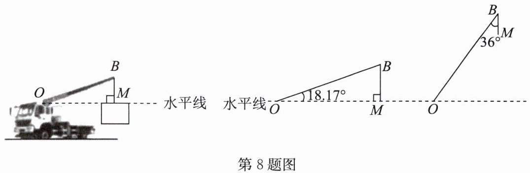 8. (2025·凉山州)如图,某型号起重机吊起一货物 $ M $ 在空中保持静止状态时,货物 $ M $ 与点 $ O $ 的连线 $ MO $ 恰好平行于地面,$ BM = 3 $ 米,$ ∠ BOM = 18.17° $.(结果精确到 1 米,参考数据:$ \sin 18.17° \approx 0.31 $,$ \cos 18.17° \approx 0.95 $,$ \tan 18.17° \approx 0.33 $,$ \sin 36° \approx 0.59 $,$ \cos 36° \approx 0.81 $,$ \tan 36° \approx 0.73 $)