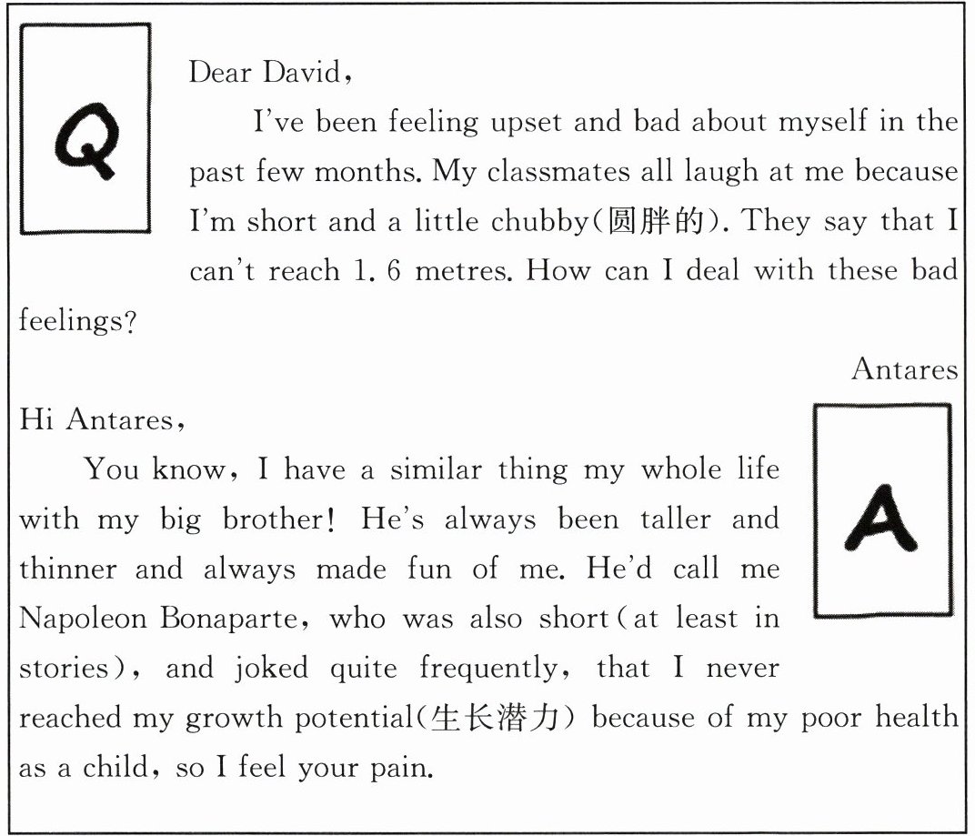 While keeping good health, taking regular exercise and eating right—fiber, vegetables, fruit and meat may help, and you may have to learn to live with your height and accept it. The thing is, I look back on my brother's and others' comments(评价)with humour now. In the end, it was all character building. Everyone has something about them that they don't like, or want to change, and that others will exploit(利用). But it's who we are. Don't let these comments get to you. Laugh them off and stand proud. And honestly, people who try to make others small are really small people. Bigness comes from inside, not from outside.