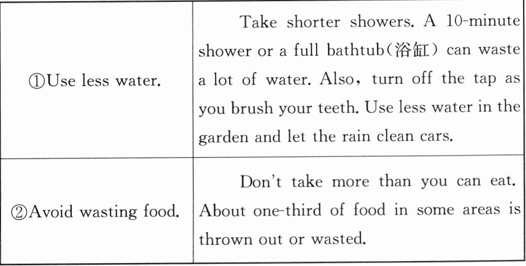 2. D 【点拨】5 个建议中“Use reusable bags. ”和“Use fewer paper cups. ”是有关再利用的建议。故选 D。