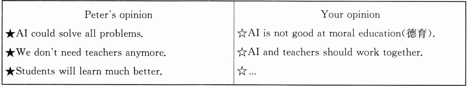 你和美国网友Peter在对"人工智能(AI)是否能替代教师"的讨论上产生了分歧,请你根据下面的提示,写一篇短文。