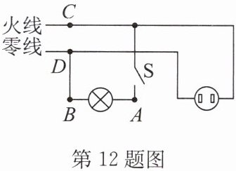 12. (2025·南通二模)如图所示的家庭电路中,闭合开关后灯泡不亮. 用测电笔检测插座的两孔,发现只有插入右孔时氖管才发光. 用测电笔检测 $A$ 点氖管发光,检测 $B$ 点氖管不发光. 发生这一现象的原因可能是(