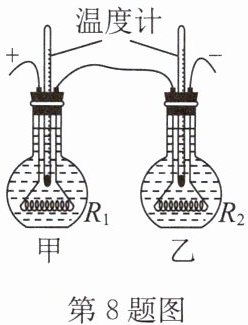 8. 如图所示,将两段电阻丝 $R_{1}$、$R_{2}$ 分别安装在甲、乙两个相同的装置中(装有等量同种液体),已知 $R_{1}>R_{2}$,通电一段时间后可以观测到