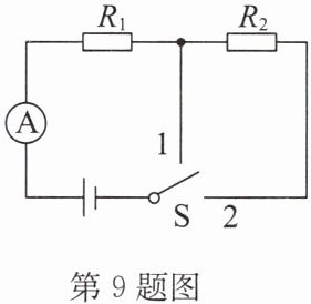 9. (2025·四川)学校举办科技节活动,小李同学利用所学知识设计了一款电热杯垫参加展评,该杯垫具有“加热”和“保温”两种功能. 他设计的电路如图所示,电源电压为 $12V$,$R_{1}$、$R_{2}$ 为两个发热元件,其阻值不随温度变化,$R_{2}$ 的阻值为 $8\Omega$,当开关 $S$ 接 $2$ 时,电流表的示数为 $1A$. 求: