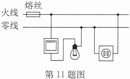 11. (2025·常州)如图所示的家庭电路,闭合开关,灯泡发光. 一段时间后,突发熔丝熔断. 下列四种电路故障中:①开关处短路,②开关处断路,③灯泡处短路,④插座内左右金属片接触,会导致熔丝熔断的是(