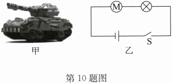 10. 图甲是一款能自动变形、万向行走的坦克玩具,其简化电路如图乙所示. 该玩具的电源电压为 4.5V,闭合开关后,规格为“0.5V 0.2W”的指示灯正常发光,线圈电阻为 0.5Ω 的电动机正常工作,则(