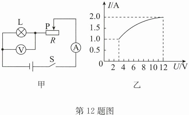 12. 如图甲所示,电源电压为 12V 且保持不变,闭合开关 $ S $ 后,当滑片 $ P $ 从最右端向最左端滑动的过程中,小灯泡 $ L $ 的 $ I-U $ 关系图像如图乙所示,最后小灯泡正常发光,下列说法中错误的是(