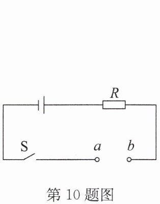 10. 如图所示的电路中,电源电压保持不变,R 为定值电阻,当开关闭合时,接在 a、b 间标有“6V 2W”字样的小灯泡 $ L_1 $ 恰好正常发光;若保持 R 不变,将 $ L_1 $ 换成另一只标有“6V 3W”字样的小灯泡 $ L_2 $,闭合开关后,小灯泡 $ L_2 $ 工作时消耗的实际功率(
