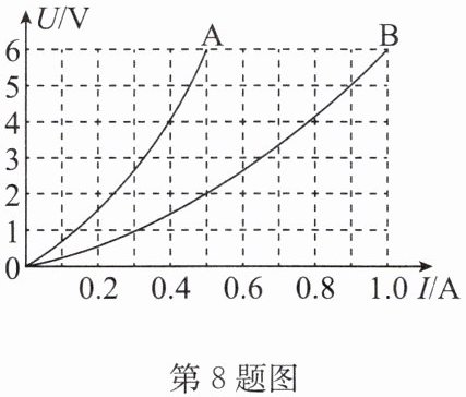 8. 小明有两只小灯泡 A、B,额定电压均为 6V,小明从使用说明书中发现灯泡 A 和 B 中电流随两端电压变化关系的图像如图所示.
