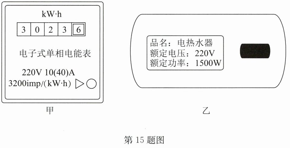 W. 现仅接通一台如图乙所示的电热水器,观察到电能表脉冲指示灯 1min 内闪烁 80 次,则 1min 内消耗的电能为9×10⁴