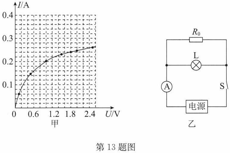 13. (2024·南通)图甲是灯泡 L 的 I-U 图像,灯泡的额定电压为 2.5V. 将灯泡 L 接入图乙电路,已知电阻 $ R_0 $ 的阻值为 5Ω,电流表的量程为 0~0.6A,电源电压可调. 在电路安全工作的前提下,下列判断正确的是(提示:可在图甲中作出电阻 $ R_0 $ 的 I-U 图像)(