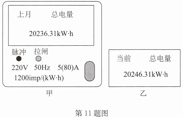 11. (2024·南京模拟)小明发现家里的电能表没有转动的铝盘,取而代之的是脉冲信号灯,用电时脉冲信号灯闪烁,闪烁越快则相同时间内用电越多,示数由液晶板显示,按键可以切换显示的内容.如图甲中显示的是截至上个月末电能表记录的总电量,为