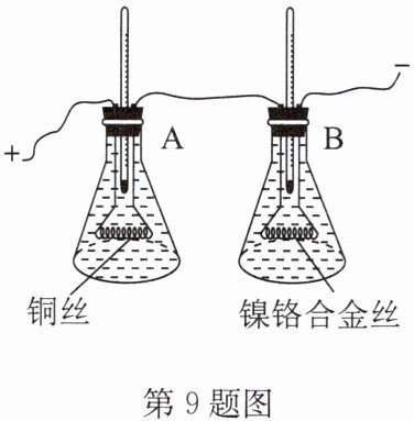 9. 为研究通电导体产生热量的多少与电阻的关系,小明找来了如图所示的实验器材,其中A、B两个相同的瓶内分别装有质量和初温都相等的煤油,将选择好的铜丝和镍铬合金丝浸没在煤油中,两支温度计分别测量两瓶中煤油的温度.