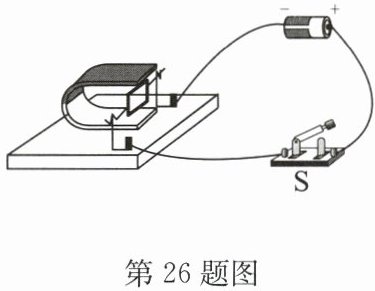26. (8 分)如图所示为小科和小江制作的一种直流电动机模型,他们用回形针做成两个支架,分别与电池的两极相连;用漆包线绕一个矩形线圈,以线圈引线为轴,并用小刀刮去轴的一端全部漆皮,另一端只刮去上半周漆皮,将线圈放在支架上,蹄形磁体放在线圈周围.