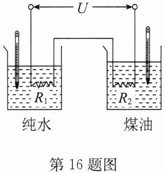16. 如图所示,烧杯中分别盛有质量相等的纯水和煤油,通电一段时间后(液体均不沸腾),发现两支温度计示数上升的度数相同. 不考虑热损失,则电热丝 $ R_{1} $、$ R_{2} $ 的阻值大小关系是(