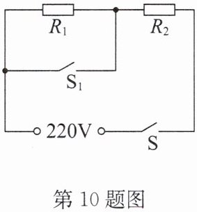 10. 如图是一款煲汤用的电热锅工作原理的简化电路图,该电热锅有两挡,分别是高温挡和保温挡.R₁与R₂均为电热丝,R₁的阻值为66Ω,S₁为温控开关,保温挡时的总功率是440W.求: