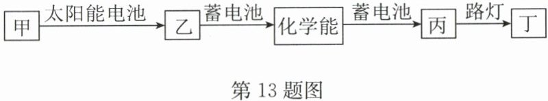 13. 某路灯照明系统的太阳能电池白天将太阳能转化为电能,对蓄电池充电,晚上蓄电池对路灯供电. 对下图方框中能量形式判断正确的是(