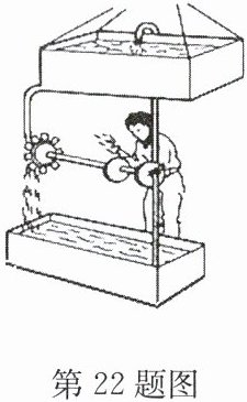 22. 如图所示是某研究小组精心设计的一种机械,高处的水通过左侧的管道向下流动,水流冲击叶片,叶片的转动带动砂轮转动,就可以打磨需要的工件,同时带动右侧的抽水器将水从低处抽到高处,继续向下流动,从而永不停歇. 你认为这种机械是否能够一直工作下去,请说明原因:
