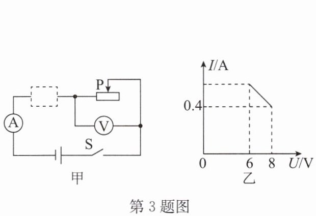 3. A 点拨:由题图甲可知,定值电阻或小灯泡与滑动变阻器串联,电流表测量电路中的电流,电压表测量滑动变阻器两端的电压。根据欧姆定律可得,滑动变阻器的 $I$ 和 $U$ 关系式为 $I = I_{定} = \frac{U_{定}}{R_{定}} = \frac{U_{电} - U}{R_{定}} = \frac{U_{电}}{R_{定}} - \frac{U}{R_{定}}$ 或 $I = I_{L} = \frac{U_{L}}{R_{L}} = \frac{U_{电} - U}{R_{L}} = \frac{U_{电}}{R_{L}} - \frac{U}{R_{L}}$,由题图乙可知,滑动变阻器的 $I - U$ 图像为一次函数关系图像,则虚线框内的元件阻值为一定值,由于小灯泡的电阻随温度的变化而变化,不是一个定值,所以虚线框内是定值电阻,不是小灯泡,故①错误。由于电压表的量程大于电源电压,故滑动变阻器的滑片可以移动到最大阻值处,由题图乙可知,滑动变阻器两端的电压最大为 $U_{max} = 8V$,通过电路的最小电流为 $I_{min} = 0.4A$,则滑动变阻器的最大阻值为 $R_{max} = \frac{U_{max}}{I_{min}} = \frac{8V}{0.4A} = 20\Omega$,故④正确。此时定值电阻两端的电压为 $U_{定} = U_{电} - U_{max} = 12V - 8V = 4V$,定值电阻的阻值为 $R_{定} = \frac{U_{定}}{I_{min}} = \frac{4V}{0.4A} = 10\Omega$。当滑动变阻器两端的电压最小时,电路中的电流最大,此时定值电阻两端的电压为 $U'_{定} = U_{电} - U_{min} = 12V - 6V = 6V$,电路中的最大电流为 $I_{max} = I'_{定} = \frac{U'_{定}}{R_{定}} = \frac{6V}{10\Omega} = 0.6A$,电路的最大功率为 $P_{max} = U_{电}I_{max} = 12V × 0.6A = 7.2W$,故②错误。当 $P_{定} = P_{滑}$ 时,由 $P = UI = I^{2}R$ 可知,定值电阻与滑动变阻器两端的电压相等,根据串联电路的分压原理可知,滑动变阻器接入电路的阻值与定值电阻的阻值相等,为 $10\Omega$,故③正确。故选 A。