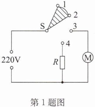 1. 洗发后,小丽站在镜前使用电吹风吹头发. 电吹风简化电路如图所示,旋转扇形开关 S,实现断开、冷风、热风的转换,已知吹冷风时的功率为 100W,R = 48.4Ω,若家中只有电吹风工作,她用冷风、热风挡交替使用 5min,标有“1200imp/(kW·h)”的电能表指示灯闪烁 90 次,则电吹风消耗