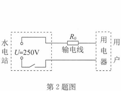 2. 现有一个小型水电站,如图所示,发电机提供的电压 U = 250V,保持恒定,通过输电线向较远处用户输电,输电线的总电阻 R₀ = 0.15Ω,闭合开关,若发电机提供给电路的总功率 P = 50kW,则通过输电线的电流为