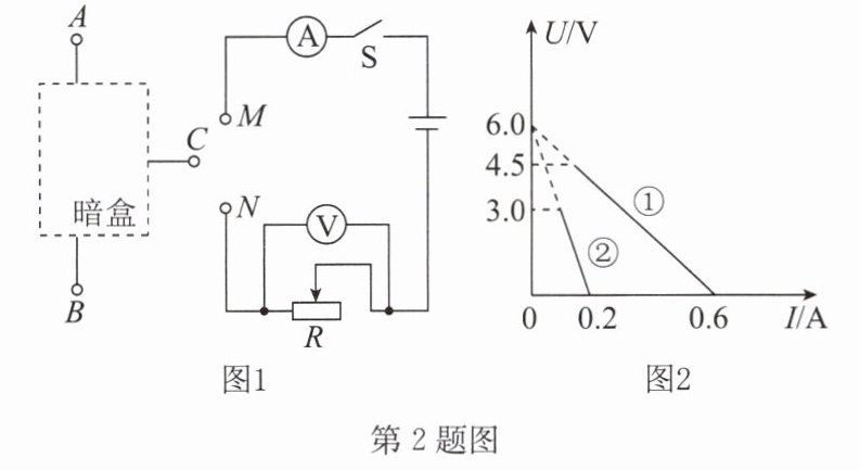 2. 如图1所示,暗盒有三个接线柱A、B、C,其内部有两个定值电阻$ R_1 $、$ R_2 $,其中$ R_2 = 20Ω $.当M接A,N接B时,闭合开关S,将滑动变阻器的滑片从右端逐次移至左端,绘制电压表示数与电流表示数的关系图像如图2中图线①所示;当M接A,N接C时,重复操作,得到图线②;则电源电压$ U = $