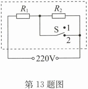 13. 在家庭用电的调查研究综合实践活动中,小明发现电热水壶工作时有两挡,分别是加热挡和保温挡.其工作原理如图所示(虚线框内为电热水壶的发热部位).查看说明书知道加热挡的功率是 1100W,保温挡的功率是 22W.当开关 S 置于