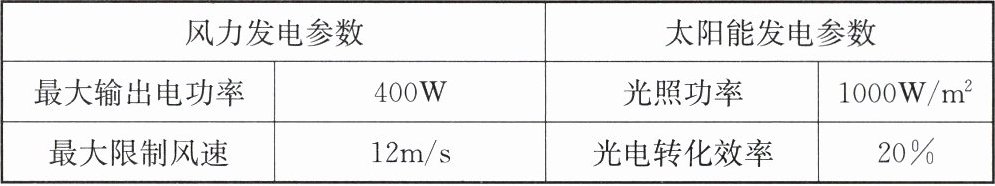 下表为某型号风光互补路灯系统的部分技术参数,其中风力发电的最大输出功率是指风速达到最大限制风速时风力发电机的输出功率;光照功率 P 是指太阳光照射到电池板表面处每平方米的辐射功率,P = 1000W/m²,光电转化效率是指太阳能电池板将光能转化为电能的效率.