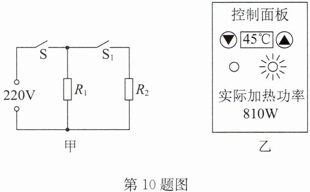 10. 孝顺的小梅同学给爷爷购买了一台额定电压为 220V 的双挡位电热足浴器,其控制面板可以显示设定温度和实际加热功率,足浴器内部简化电路及某次加热工作时控制面板的显示情况如图甲、乙所示,其中 $ R_1 = R_2 = 96.8\Omega $. 求: