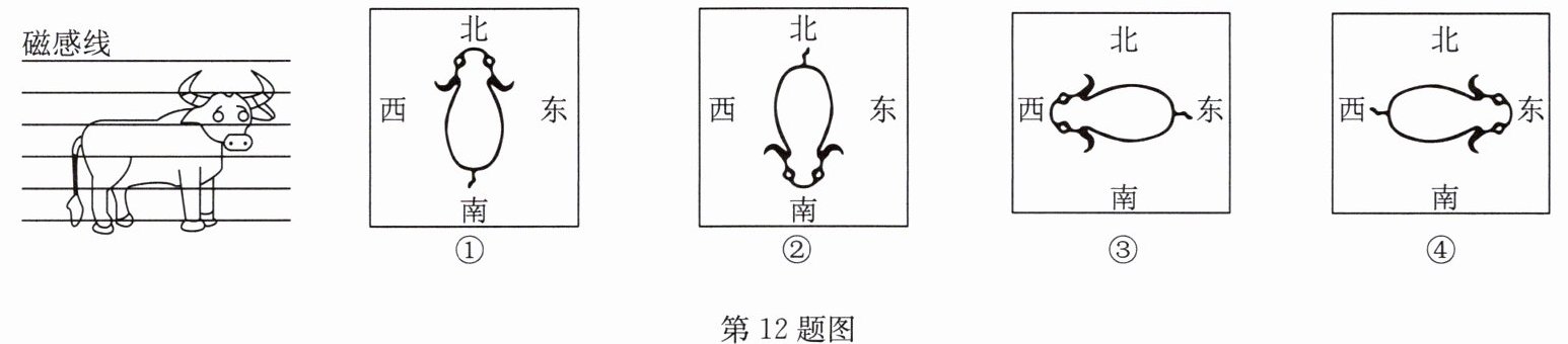 12. (2024·常州)美国《发现》网站于 2023 年 10 月报道:“牛能感知地球磁场,吃草、休息时,其身体朝向习惯与地磁场磁感线平行(如图所示).”为求证真伪,同学们设计了如下实验方案:在四周无明显差异的草地上,多次观察牛吃草、休息时的身体朝向,若报道真实,则牛的身体朝向习惯性呈现四个场景中的(