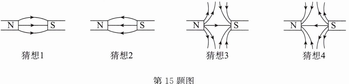 15. 在研究两个靠近的异名磁极周围磁感线的分布时,几位同学提出了如图所示的四种猜想: