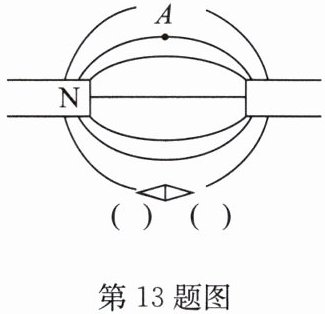 13. 如图所示是两个磁极靠近时磁感线的分布情况,根据图中标示的 N 极,在括号内标出静止小磁针的 N、S 极并标出 A 点磁感线的方向.