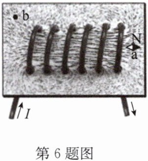 6. (2025·泰安)在探究“通电螺线管的磁场是什么样的”实验中,通电后观察小磁针 a 静止时 N 极的指向,轻敲纸板观察铁屑的排列情况,现象如图所示. 下列说法正确的是 (